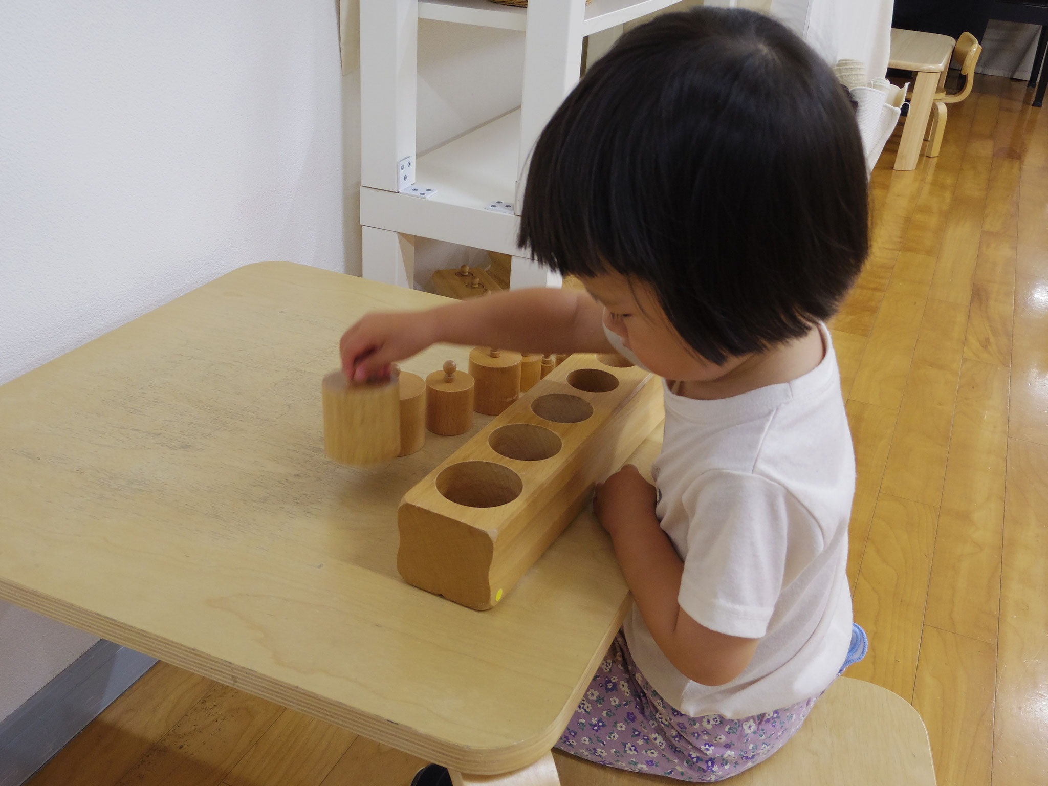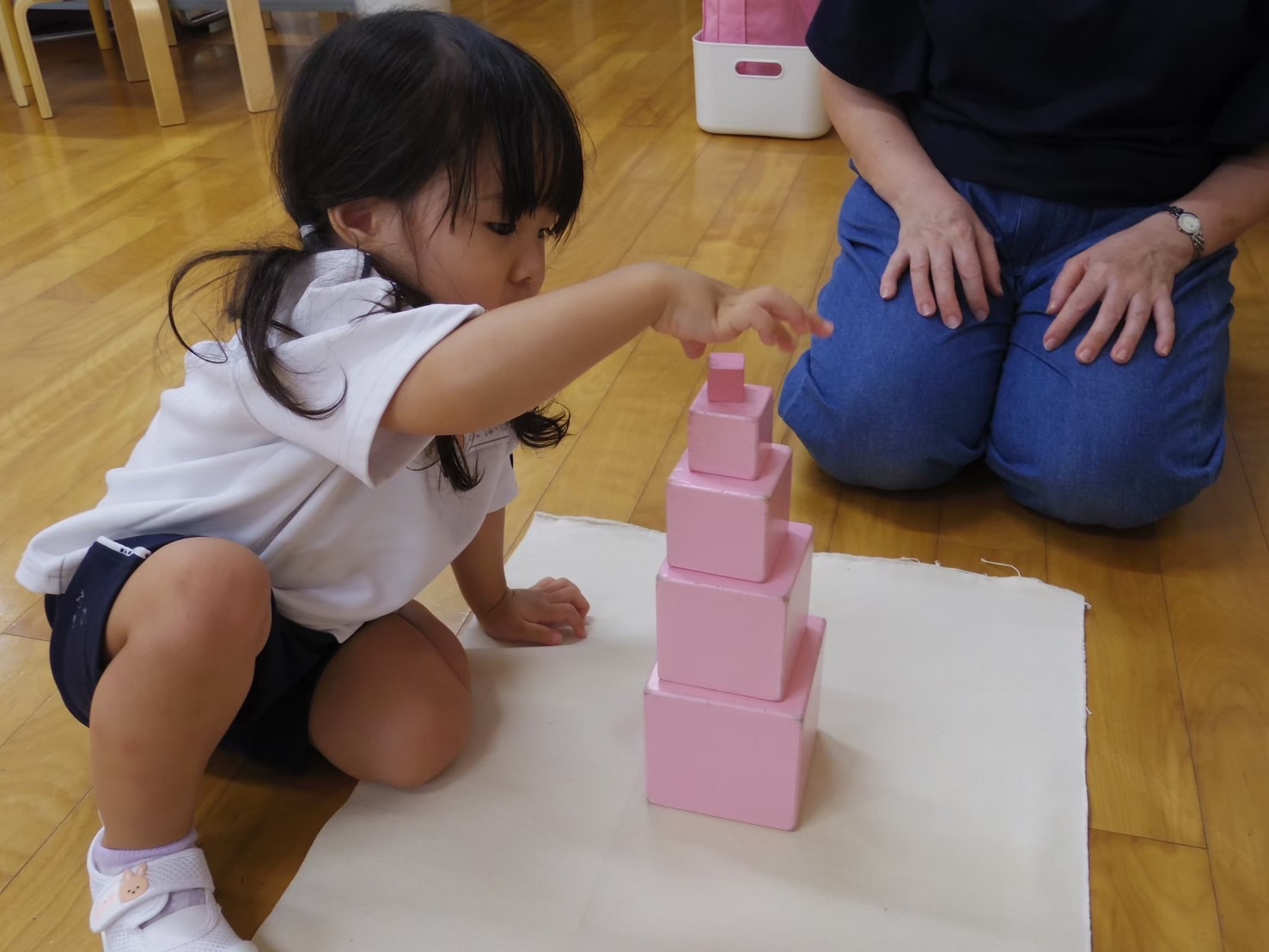 モンテッソーリ教育ならではの教具で、手を動かして視覚をきたえます。