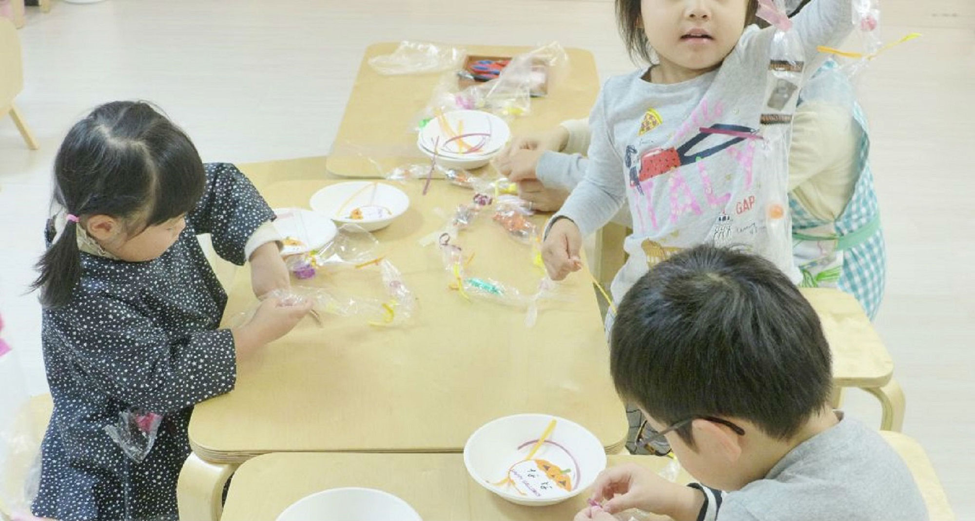 バンビーニクレアーレでは、毎年10月にハロウィンにちなんだレッスンを行います。今年のおやつは自分で作るお菓子の首飾り「キャンディレイ」。ハロウィンのレッスンに向けて、「キャンディレイ」をつくる活動を行いました。