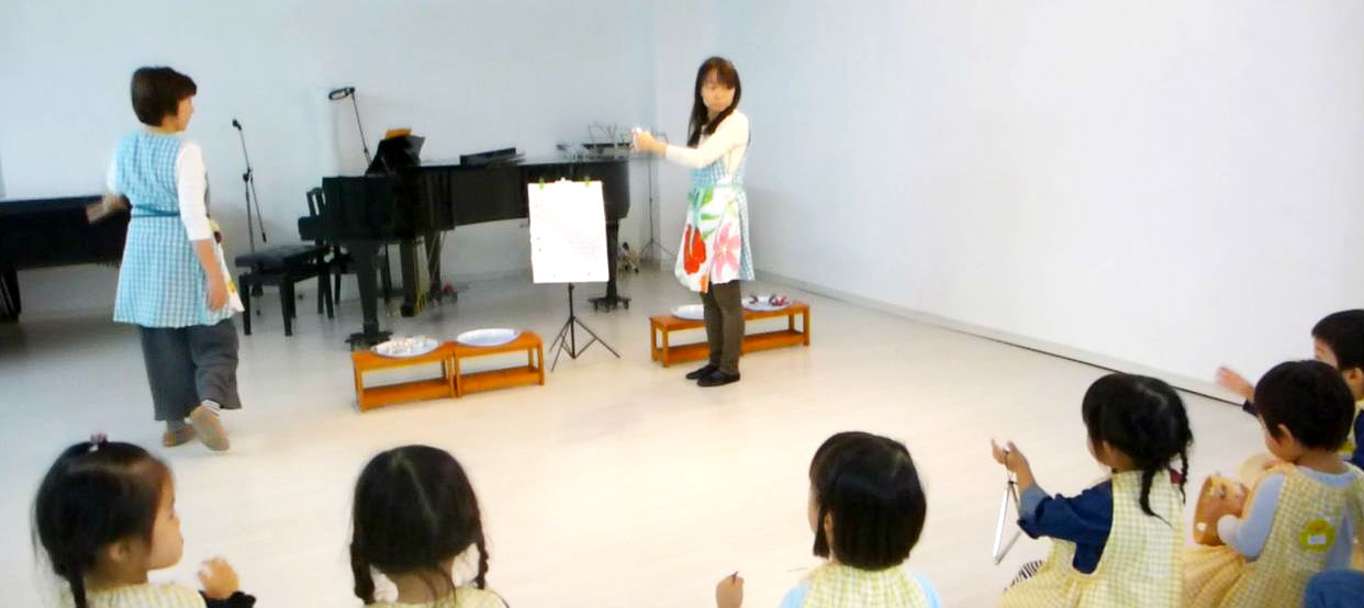 ステッラコース、フィオーレコースでは、モンテッソーリの活動を1時間した後に、リトミックを集中して30分間行います。前半に音楽に合わせて楽しく体を動かした後はパネルシアター。パネルシアターに登場する生き物に合わせてみんなで音楽表現をします。